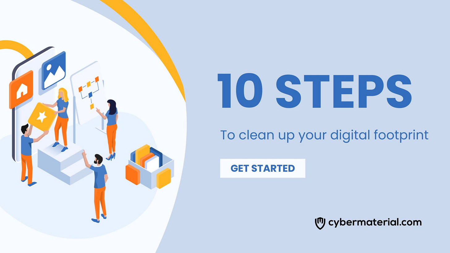 Documents10 steps to clean up your digital footprintCyberMaterialFeb 07, 2023∙ Paid1Share1. Do a full name search into several search enginesSearch for your first and last name using multiple search engines, such as Google, Bing, DuckDuckGo. If you’ve recently changed your name, look up …Continue reading this post for free, courtesy of CyberMaterial.Claim my free postOr purchase a paid subscription.PreviousNext