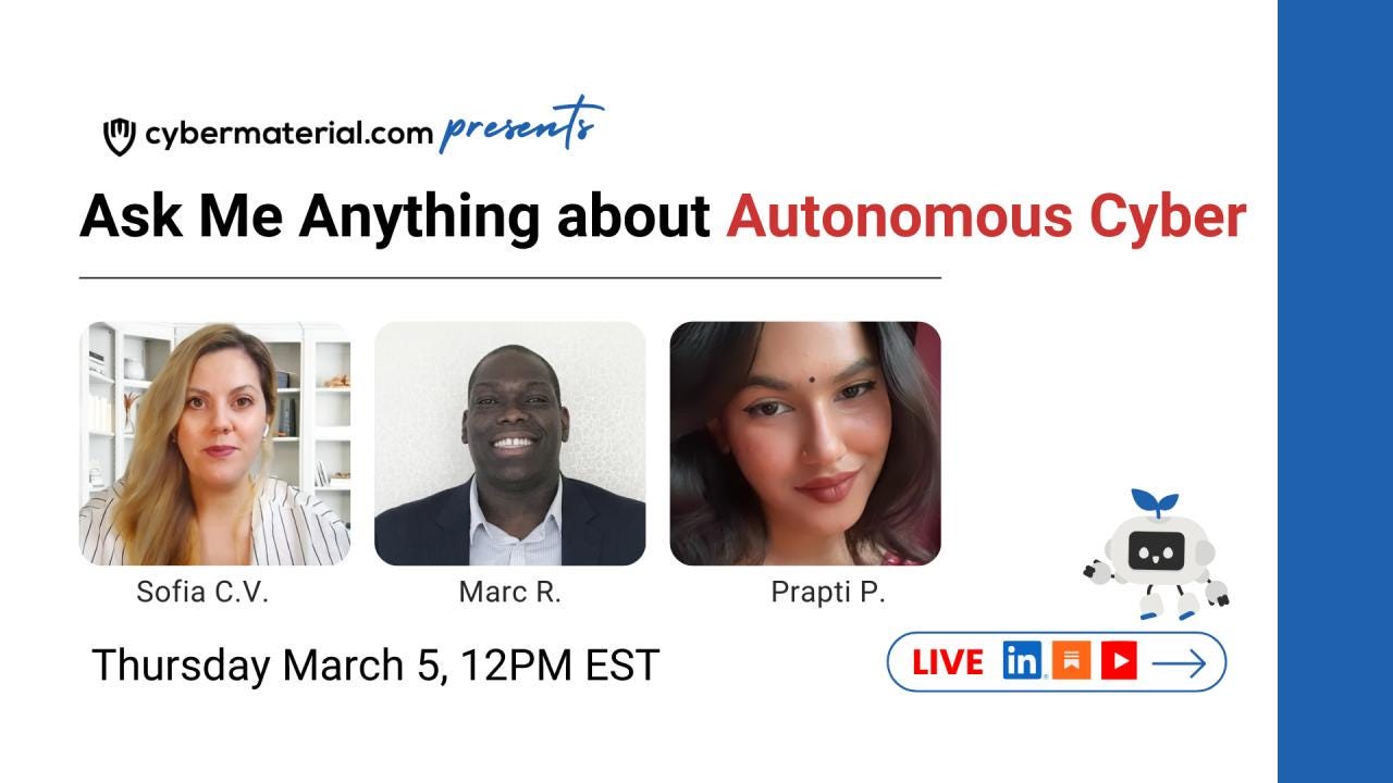 EventsAsk Me Anything about Autonomous Cyberπ Thursday, March 5 | π 12:00 PM ESTCyberMaterialFeb 26, 2026β PaidSharePractical cybersecurity conversations, led by professionals.Join Ask Me Anything Cyber for an exploration of Autonomous Cyber, a series focusing on the critical shift from human-led security operatioβ¦Continue reading this post for free, courtesy of CyberMaterial.Claim my free postOr purchase a paid subscription.Previous