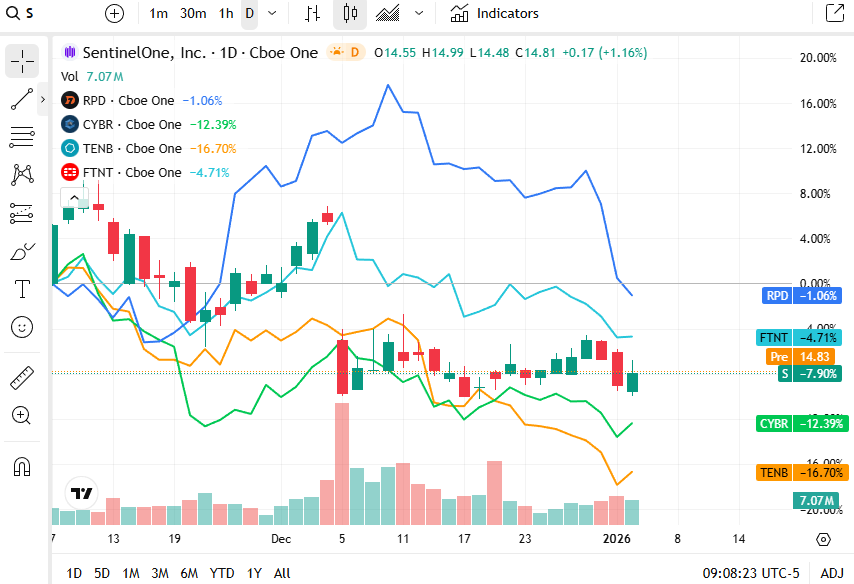 SentinelOne closed at 14.81 dollars and inched higher, reflecting continued investor interest in AI-driven endpoint detection and response solutions despite broader caution in tech.