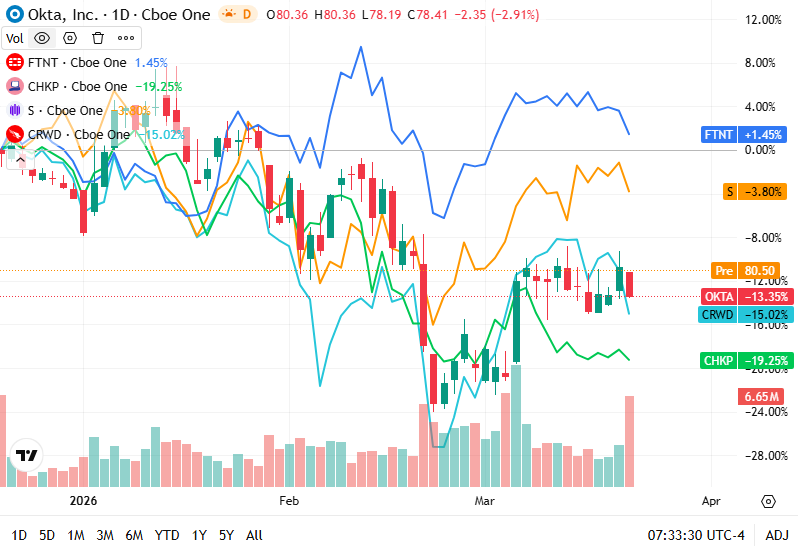Okta closed near ~84–86 dollars and was relatively flat, as identity security stocks continued consolidating after prior declines.