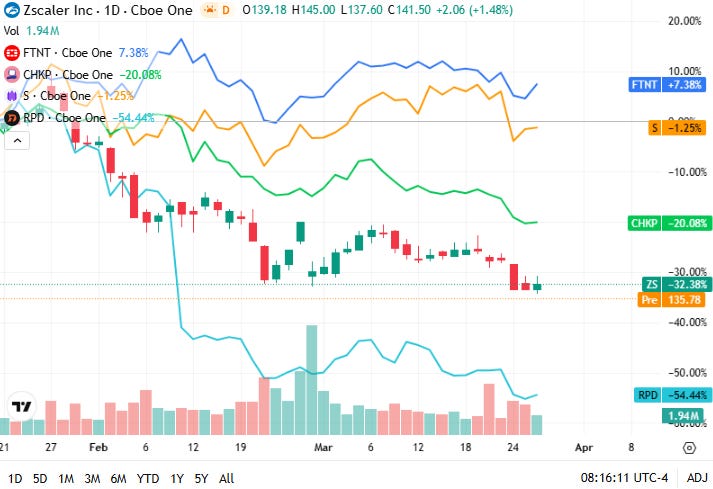SentinelOne closed at 13.40 dollars and was slightly higher, indicating selective buying in endpoint security despite the risk-off market tone.